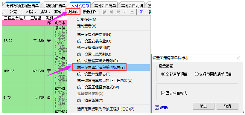 如果清單全部要固定:需按上面操作完之后,再點(diǎn)擊塊操作下的統(tǒng)一設(shè)置固定清單單價標(biāo)志功能。