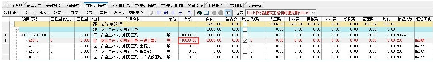 答:可以在措施項目清單界面通過鎖定功能實現(xiàn)將安全文明費(fèi)設(shè)置為固定費(fèi)用,即直接在定額行單價那輸入固定的數(shù)值。
