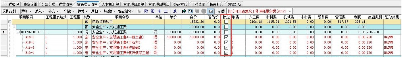 如果不希望文檔屬性或者費(fèi)率重置的時候會將固定好的安全文明施工費(fèi)再重置,則需要將所有的分專業(yè)的安全文明施工費(fèi)的定額行都固定。如下截圖: