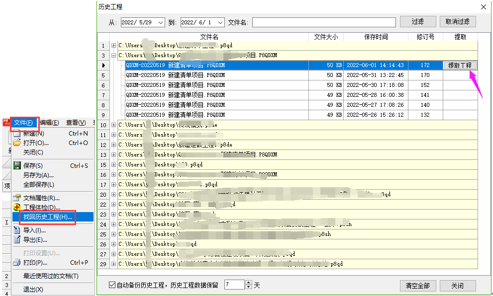 答:軟件提供找回歷史工程的功能,默認(rèn)是保留七天以內(nèi)的工程數(shù)據(jù)的。 點(diǎn)擊菜單欄文件下的找回歷史工程,在彈出的窗口找到對應(yīng)工程點(diǎn)開加號,對照保存時間列找到相應(yīng)時間點(diǎn)的工程,提取工程數(shù)據(jù)即可。如下所示: