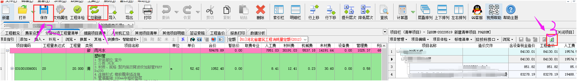 答:針對與p8qdxm的非單文件項目工程,它是跟單位工程數(shù)據(jù)聯(lián)動的。如果出現(xiàn)了數(shù)據(jù)沒有同步匯總,需要按照以下步驟操作。 第一步打開單位工程點(diǎn)擊匯總刷新,然后點(diǎn)擊保存。如果保存按鈕是灰顯,說明數(shù)據(jù)可能沒有變化會導(dǎo)致正常匯總不了??梢圆扇‰S便改動一下數(shù)據(jù)再改回的方法,在保存按鈕綠顯的狀態(tài)下點(diǎn)擊保存。所有單位工程都刷新保存了之后,關(guān)閉單位工程,最后一步就是回到項目工程中點(diǎn)擊重新提取數(shù)據(jù)。 如下截圖所示: