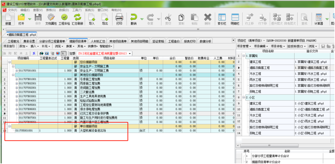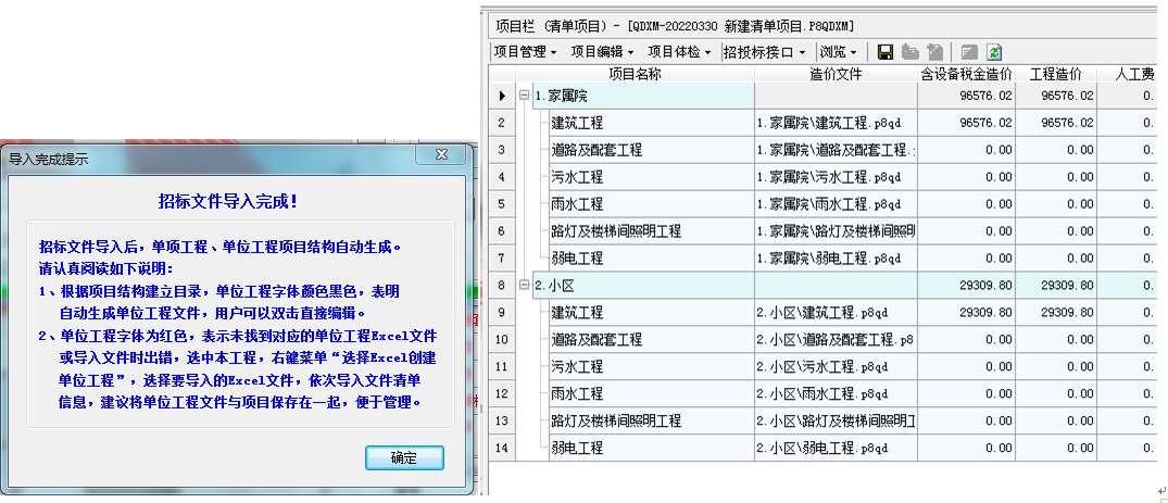 項目文件中含有的所有單位工程的內(nèi)容實現(xiàn)了一鍵導(dǎo)入,包括了分部分項清單、措施項目清單和其他項目清單部分。 需要注意:EXCEL文件中需要有單項工程費(fèi)匯總表及其對應(yīng)的單位工程excel數(shù)據(jù)。(主要是為了保證按照相應(yīng)的結(jié)構(gòu)建立生成造價文件)
