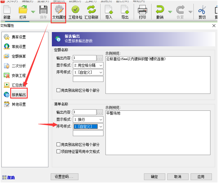答:本身清單項目特征序號自動有默認(rèn)排序,導(dǎo)入Excel版工程量清單之后項目特征序號出現(xiàn)了重復(fù)。 按照以下截圖,通過文檔屬性窗口的報表輸出功能,把序號樣式改成自定義即可。