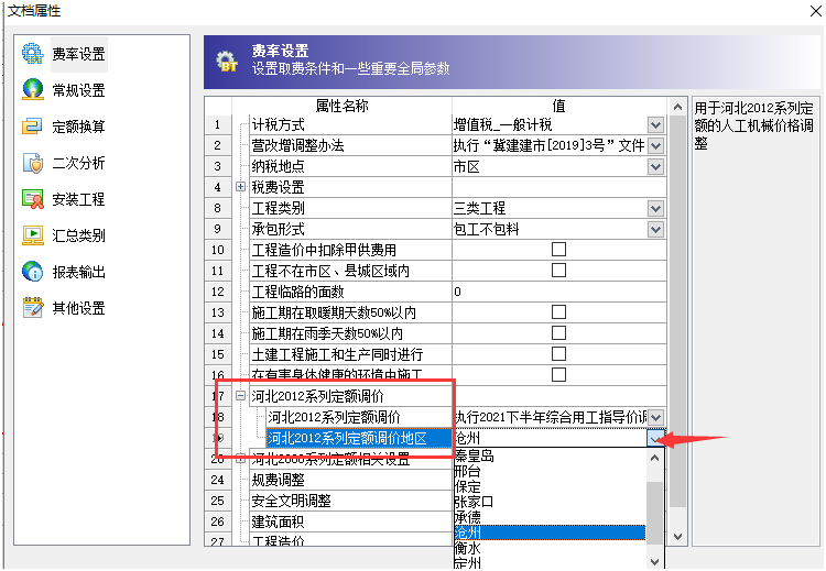 答:各地市出文件的時間不一致,大家使用的時候一定要更新到最新版本軟件程序。 更新到最新版本之后,點(diǎn)擊文檔屬性窗口,在默認(rèn)的第一個費(fèi)率設(shè)置界面可以切換選擇對應(yīng)時間對應(yīng)地市的人工指導(dǎo)價文件。如下截圖: