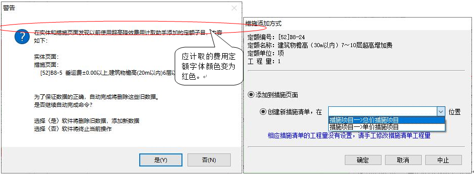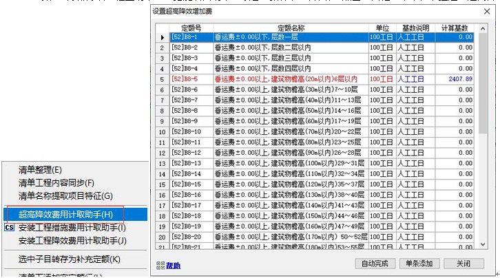 3)、執(zhí)行該命令,彈出如下窗口,應(yīng)計取的超高及垂運(yùn)費(fèi)用定額將變成紅色,其計取基數(shù)變成藍(lán)色。 4)、直接雙擊紅色定額行 或 點(diǎn)擊“單條添加”按鈕,可實現(xiàn)單條添加該項費(fèi)用定額到當(dāng)前選擇的位置。點(diǎn)擊“自動完成”按鈕,將自動添加當(dāng)前工程所有的“垂運(yùn)費(fèi)”和“超高費(fèi)”定額,點(diǎn)擊“自動完成”按鈕后,點(diǎn)擊自動完成,系統(tǒng)自動檢測工程中是否已經(jīng)存在相關(guān)費(fèi)用定額。如已經(jīng)計取了相關(guān)費(fèi)用,會進(jìn)行提示。