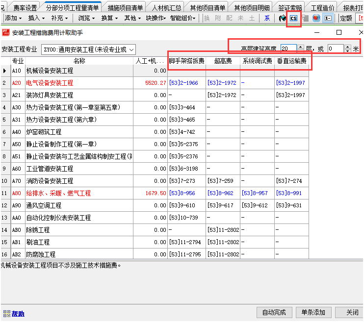 答:針對安裝專業(yè)的工程,咱們軟件提供了安裝工程措施費(fèi)用計取助手(也就是CS按鈕)的功能,一鍵計取安裝專業(yè)的超高費(fèi)、垂運(yùn)費(fèi)、腳手架搭拆費(fèi)和系統(tǒng)調(diào)試費(fèi)這四項費(fèi)用。 注意功能操作之前不需要特意選中定額子目,軟件會自動識別到安裝定額庫各個分冊的子目,來自動統(tǒng)計基數(shù),截圖如下: