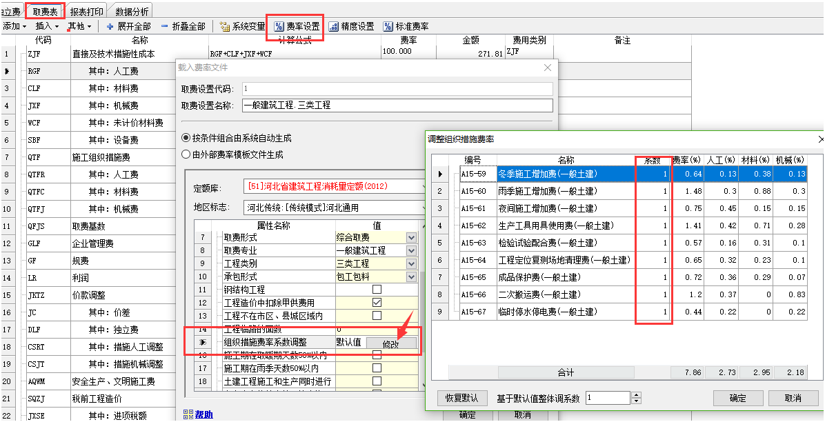 定額工程中,在取費(fèi)表界面,點(diǎn)擊費(fèi)率設(shè)置按鈕,可以通過修改組織措施費(fèi)系數(shù)來實現(xiàn)。如下截圖: