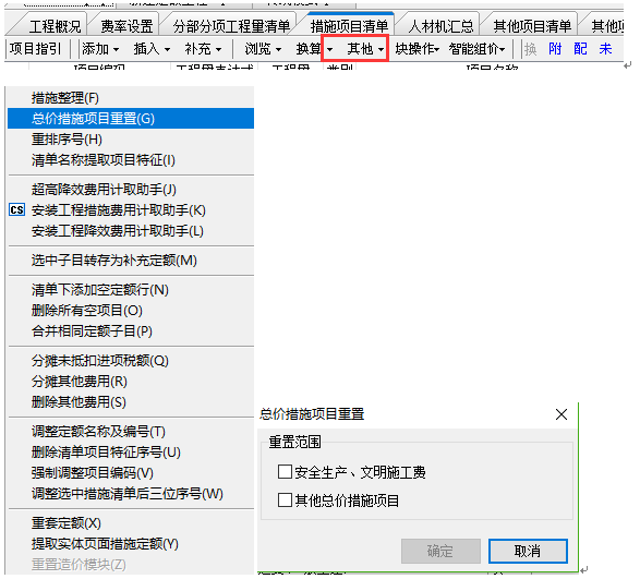 答:更新到最新版本之后,清單工程中如果安全文明或者總價措施修改了想要恢復(fù)到默認(rèn)計取的狀態(tài)??梢栽诖胧╉椖壳鍐谓缑妫c(diǎn)擊其他按鈕下的總價措施項目重置。
